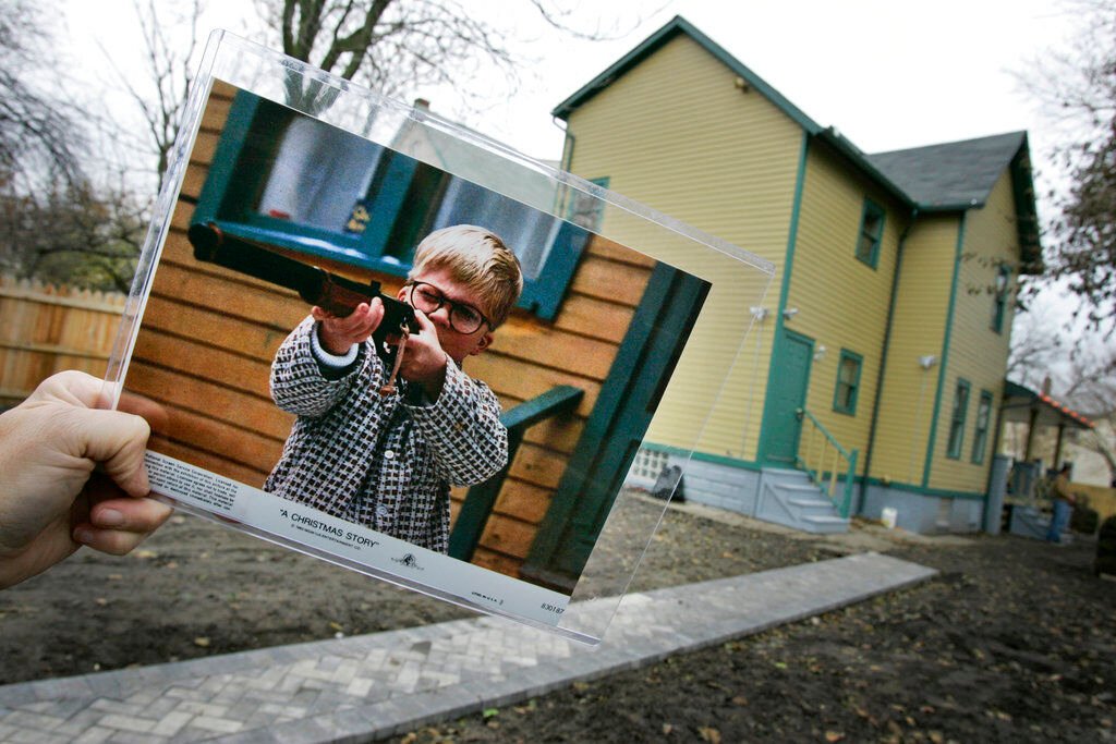 FILE – In this Nov. 13, 2006, file photo, a publicity photo of actor Peter Billingsley portraying the character Ralphie in the movie "A Christmas Story" is displayed in the backyard of the house used to film the movie's exterior shots in Cleveland.
